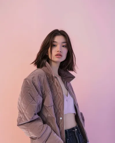 This outfit offers a mix of soft and edgy elements. The oversized quilted mauve jacket brings warmth and texture, while the light lavender crop top adds a subtle, feminine touch. Dark-wash high-waisted jeans ground the look, balancing out the pastels with a bold contrast.