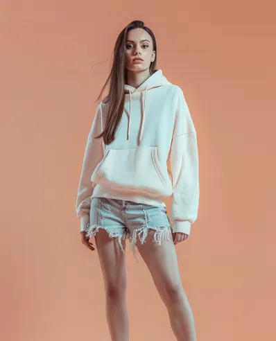 This outfit keeps things casual and cool with an oversized cream hoodie that s perfect for layering. Paired with distressed light-wash denim shorts, it gives off major relaxed, off-duty vibes. White sneakers complete the look, making it ideal for an arcade date filled with fun and games.