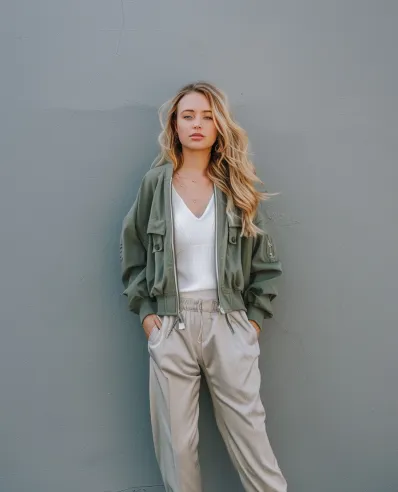 This look blends sporty and chic elements beautifully. The olive-green bomber jacket adds a cool, street-style vibe, while the satin joggers bring a touch of luxury with their soft sheen. A white V-neck top underneath keeps it simple and fresh, and the strappy heeled sandals elevate the entire outfit for a polished finish.