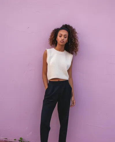 This outfit strikes the perfect balance between relaxed and stylish. The sleeveless cream knit crop top adds texture and a laid-back vibe, while the high-waisted, tapered black pants offer a flattering, structured silhouette. White sneakers tie it all together, giving it a casual edge perfect for a fun arcade date.