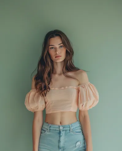 This outfit is all about soft elegance with a touch of fun. The peachy off-shoulder crop top features dreamy puff sleeves that add a playful yet feminine vibe. Paired with high-waisted, light wash distressed jeans, it strikes a balance between sweet and casual perfect for a relaxed arcade date.