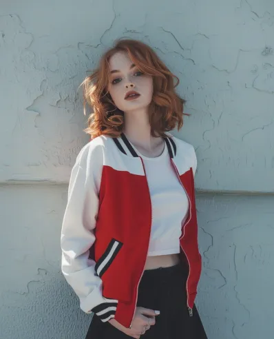 This outfit oozes playful retro vibes with a bold red and white varsity jacket layered over a cropped white tee. The black skater skirt keeps the look youthful and fun, while the jacket adds a sporty edge. The color contrast makes it eye-catching and perfectly suited for an arcade filled with neon lights and action.