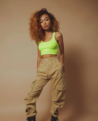This look makes a statement with a neon green cropped tank top, beige high-waisted cargo pants, and chunky black combat boots. The bright tank brings that pop of color to grab attention, while the cargo pants keep things practical with roomy pockets. The combat boots round it all out with a bold, street-style edge.