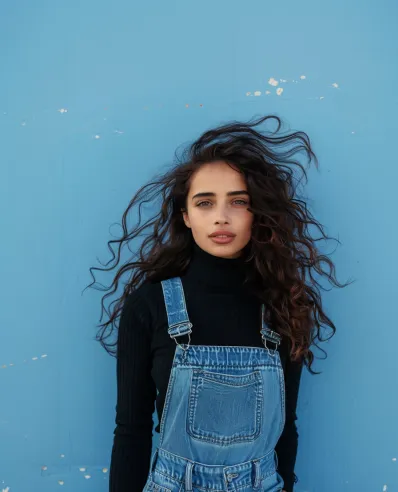 This playful yet stylish outfit pairs classic denim overalls with a fitted black turtleneck. The dark top contrasts beautifully with the vibrant blue denim, creating a polished yet casual aesthetic. The overalls bring a nostalgic, retro charm, while the turtleneck adds sophistication and warmth.