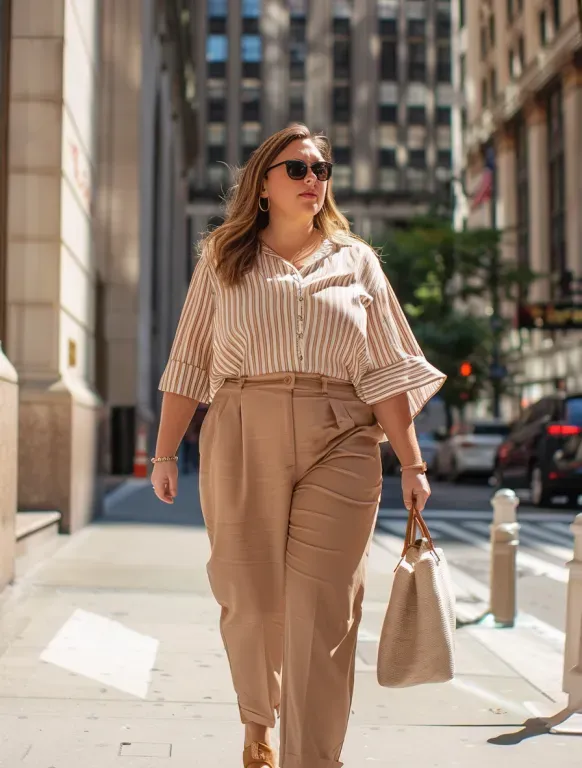 This look is effortlessly chic, featuring a beige and white striped shirt with a relaxed fit, paired with high-waisted beige trousers. The shirt has a button-down design with a slightly oversized fit, adding a casual, yet refined vibe. The trousers are loose-fitting, offering comfort and movement, while the neutral tones create a sophisticated palette. The addition of a tan handbag and matching sandals completes the look, giving it a polished, street-ready feel.