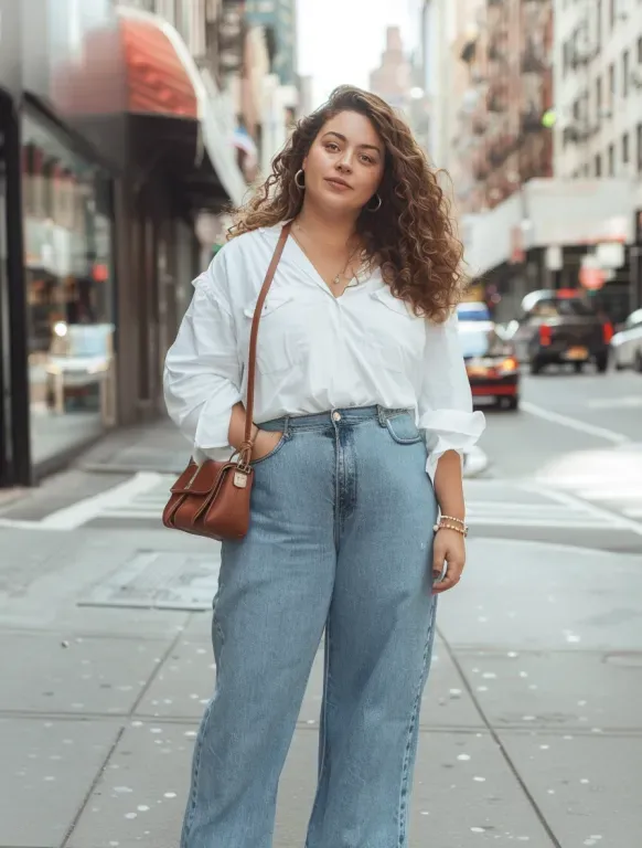 This outfit combines classic comfort with a modern twist. The loose, white button-up blouse adds a light and breezy feel, perfect for any casual outing. Paired with high-waisted, wide-leg blue jeans, it creates a flattering silhouette that gives you room to move while staying chic. A cute brown crossbody bag and fresh white sneakers tie everything together, creating a simple yet stylish look.