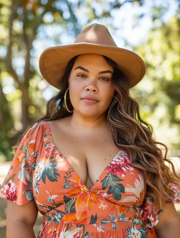 This outfit is a dream for any boho lover. The dress is a beautiful floral pattern in warm, earthy tones, giving it a vibrant and fun touch. With its flowy, A-line shape and flattering V-neckline, it offers both comfort and style. Paired with a wide-brimmed tan hat and hoop earrings, it brings an effortless, relaxed vibe. The dress s soft, flowy fabric moves with you, making it perfect for a laid-back day out in nature or a casual gathering with friends.