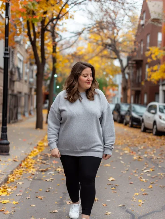 This outfit is the definition of cozy comfort, perfect for the cooler months. A soft gray sweatshirt is paired with sleek black leggings, making it an easy, no-fuss look. White sneakers keep the outfit fresh and clean, while the fall backdrop adds to the overall warm, relaxed vibe of the ensemble. The loose fit of the sweatshirt provides ultimate comfort while still maintaining a trendy edge.