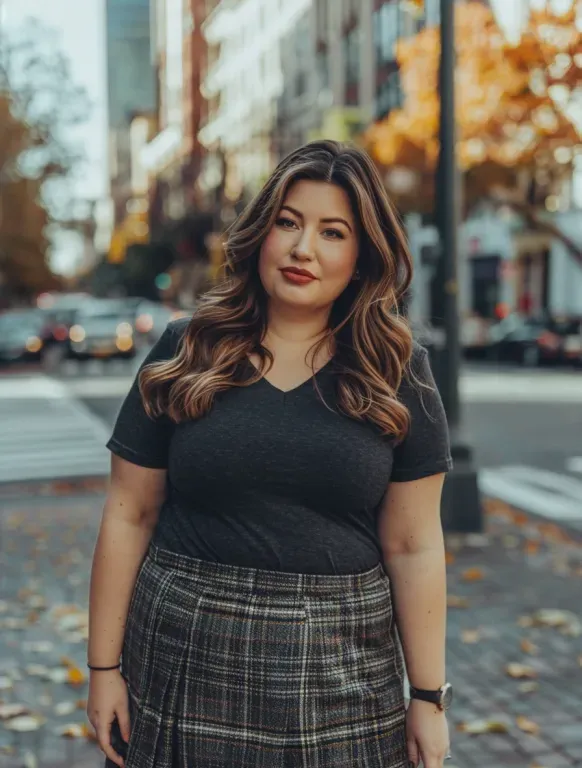 This outfit strikes a perfect balance between casual and trendy. The dark gray t-shirt is simple yet stylish, paired with a plaid pleated skirt that adds a bit of fun and flair. The skirt s classic pattern and slightly elevated waist create a flattering silhouette, while the outfit is completed with black boots that add just the right amount of edge. The urban city backdrop perfectly complements the relaxed, modern vibe of the look.