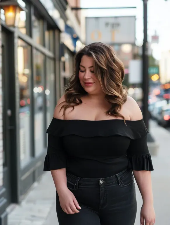 This outfit features a black off-the-shoulder top with flared sleeves, paired with high-waisted black jeans. The top s ruffled detail adds a feminine touch, while the snug fit highlights the shape of the body. The combination of a casual but stylish top with sleek black jeans gives a trendy, chic vibe perfect for a casual day out in the city or a dinner date. The simplicity of the color palette keeps it elegant and versatile.