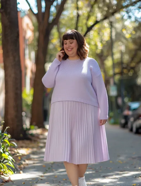This outfit is as comfy as it is stylish! A soft lavender sweater pairs perfectly with a pleated skirt, creating a balanced and feminine silhouette. The combination of the cozy knit top and flowy pleated skirt is perfect for a relaxed yet polished look. White sneakers keep it casual, while the lovely color adds a fresh and youthful vibe, making this outfit perfect for a day out in the city or a weekend brunch with friends.