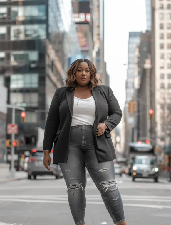 This outfit blends casual and sophisticated elements perfectly. A black tailored blazer gives the look a polished edge, while the distressed gray jeans add a trendy, laid-back contrast. Paired with a simple white top and nude heeled booties, this look is balanced and effortlessly chic. The modern city backdrop adds to the urban, fashion-forward vibe.