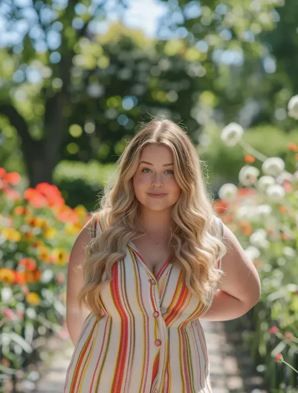 This outfit is all about those warm, sunny vibes. The dress is a beautiful striped pattern featuring bold shades of red, yellow, and orange, making it perfect for the summer months. It s a light, airy piece that gives off a relaxed, vacation-ready feel. With buttons running down the front and a flattering fit, this dress is both casual and stylish, perfect for a stroll in the park or a weekend outing. The backdrop of blooming flowers adds to the dreamy, carefree vibe.