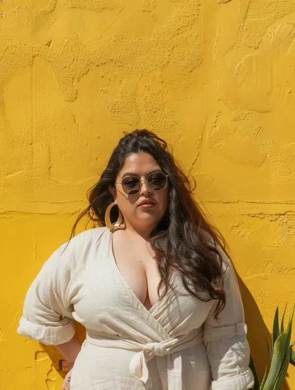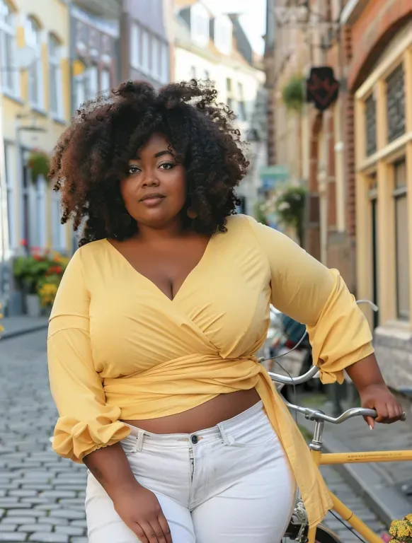 This outfit is a total sunshine moment. The wrap-style top in a warm golden yellow ties at the waist and features three-quarter puff sleeves that add just the right amount of drama. It hugs the curves beautifully and pairs perfectly with crisp white high-waisted jeans, creating a bright, balanced look that s ideal for city strolls or coffee runs on cobblestone streets.