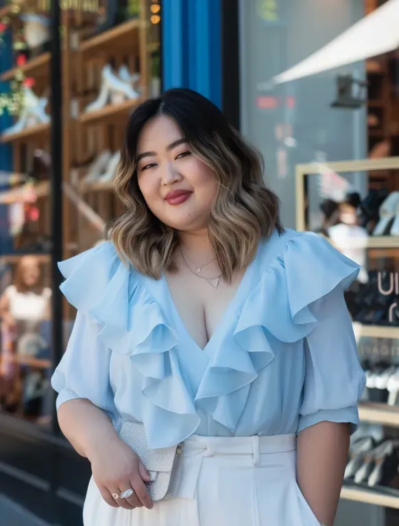 This outfit is soft, chic, and made for turning heads in the sweetest way. The blouse is a dreamy shade of powder blue with layered ruffles that frame the neckline and cascade down the front. It has elbow-length sleeves with just the right amount of volume and is tucked neatly into a pair of crisp high-waisted white trousers. Finished off with a shimmering clutch and delicate layered necklaces, the whole look is graceful yet totally modern.