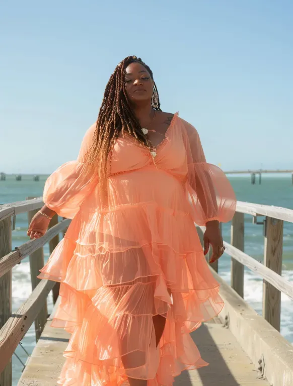 This outfit is the definition of floaty and fabulous. The sheer peach dress is made with layers of cascading ruffles that catch the light and flutter with every step. It features dreamy voluminous sleeves, a soft V-neckline, and an airy silhouette that feels like walking through a breeze. Worn over a simple slip and styled with sandals, it s beachy elegance with serious drama.