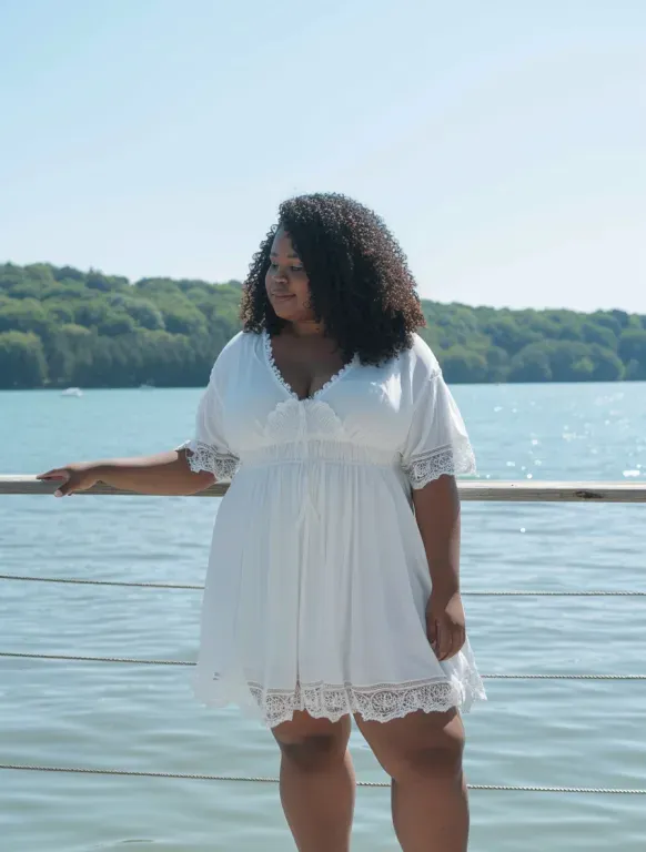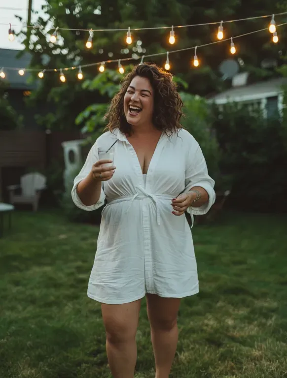 This outfit is the definition of relaxed summer charm. It s a lightweight white shirt dress with a deep neckline and rolled-up sleeves that hit just below the elbow. The front knot adds a cute cinched detail that highlights the waist, and the breathable cotton fabric makes it feel like a breeze to wear. It’s short without being too short and has that lived-in feel that s perfect for backyard get-togethers or golden hour laughs.