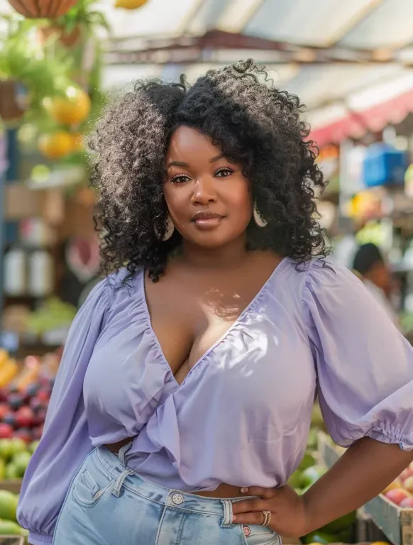 This outfit is fresh, flirty, and so easy to wear. The soft lavender blouse features dramatic puff sleeves and a deep wrap-style neckline, bringing a mix of romantic flair and modern edge. It’s slightly cropped to sit perfectly over a pair of light-wash high-waisted jeans, creating a silhouette that feels effortlessly balanced. The blouse s gathered detailing adds texture and gives the whole look that touch of breezy summer charm.