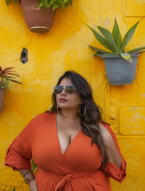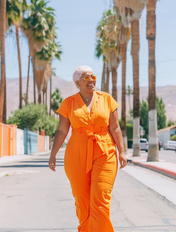 This outfit is all about confidence and color. The vibrant orange jumpsuit features short sleeves, a button-down front, and a flattering tie waist that really defines the figure beautifully. The wide-leg pants bring movement and balance to the silhouette, while the lightweight fabric keeps it breezy and summer-ready. Finished with oversized sunnies and comfy sandals, it’s giving vacation goddess with city street flair.