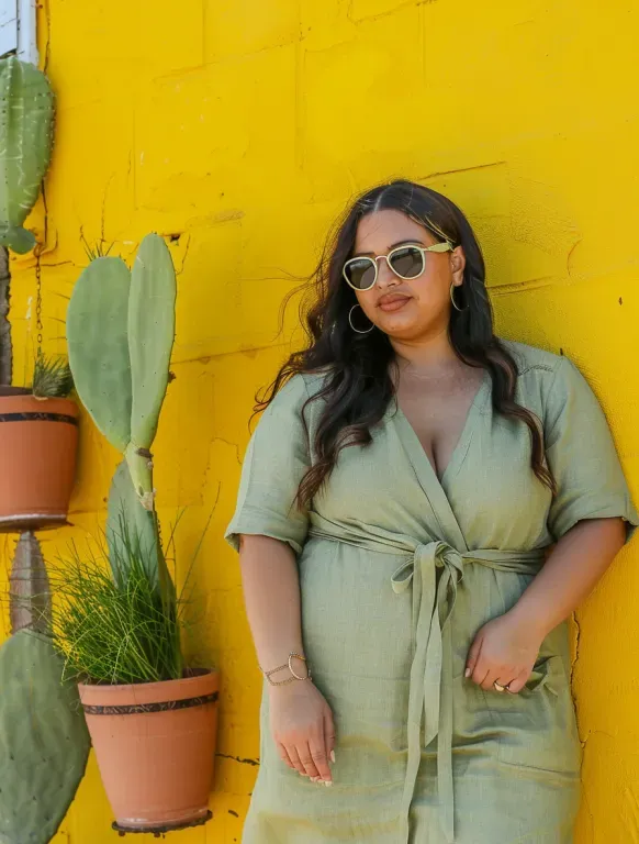 This outfit is the definition of summer ease. The light sage green wrap dress is made from breathable linen fabric, perfect for those extra warm days when you want to feel cute but not melt into a puddle. It has short sleeves for just the right amount of coverage, a tie waist that flatters your shape, and a soft V-neckline that adds a little elegance without being too much. Add in some oversized sunnies, hoop earrings, and a touch of lip gloss and you re golden.