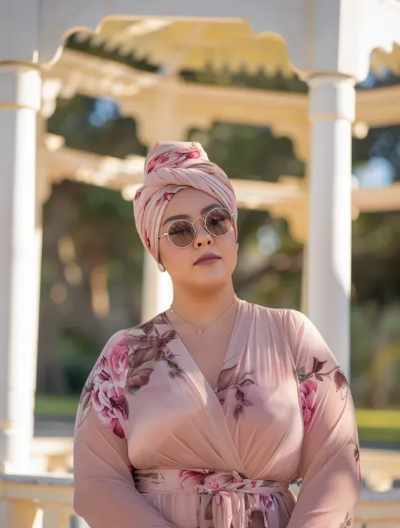 This outfit brings all the soft romantic vibes. The flowy wrap dress in a muted blush tone features delicate floral prints and dreamy long sleeves that drape beautifully down the arms. It has a V-neckline that adds a touch of elegance and a matching waist tie that gives definition without being restrictive. Paired with a coordinating turban and round sunnies, it s a full look that s effortlessly graceful.