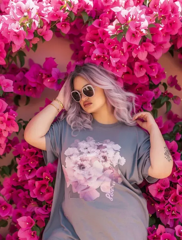This outfit is pure laid-back perfection. The oversized slate-gray T-shirt features a soft floral graphic in dreamy pastel tones, giving it that pretty-meets-chill energy. The sleeves are relaxed and roomy, and the loose fit makes it perfect for those hot days when you just want something easy and breezy. Paired with printed shorts peeking underneath, this look is low-effort but still super cute.