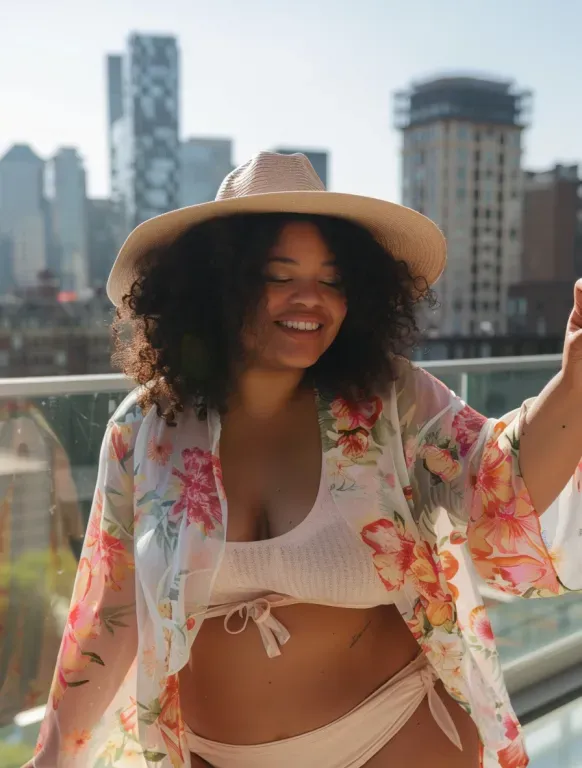 This outfit is the ultimate rooftop-ready look for sunny days. The sheer floral kimono adds a breezy layer over a soft white crop top and matching high-waisted bikini bottoms. The kimono s light fabric flows perfectly in the heat while the roomy sleeves give it an easy, relaxed fit. Topped off with a wide-brimmed straw hat, it s giving city sunshine with a beachy twist.