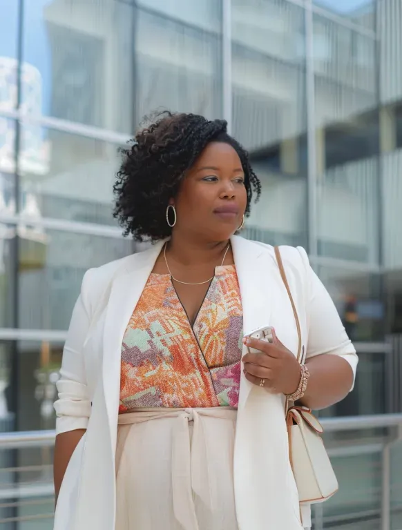 This outfit is polished, breathable, and made for warm-weather power moves. The creamy white blazer with three-quarter sleeves pairs beautifully with a soft printed blouse in shades of coral, orange, and blush. The high-waisted pants are flowy with a relaxed tie waist, giving the whole look structure without feeling stiff. The neutral palette keeps things fresh, while the bold blouse adds just the right pop of personality.