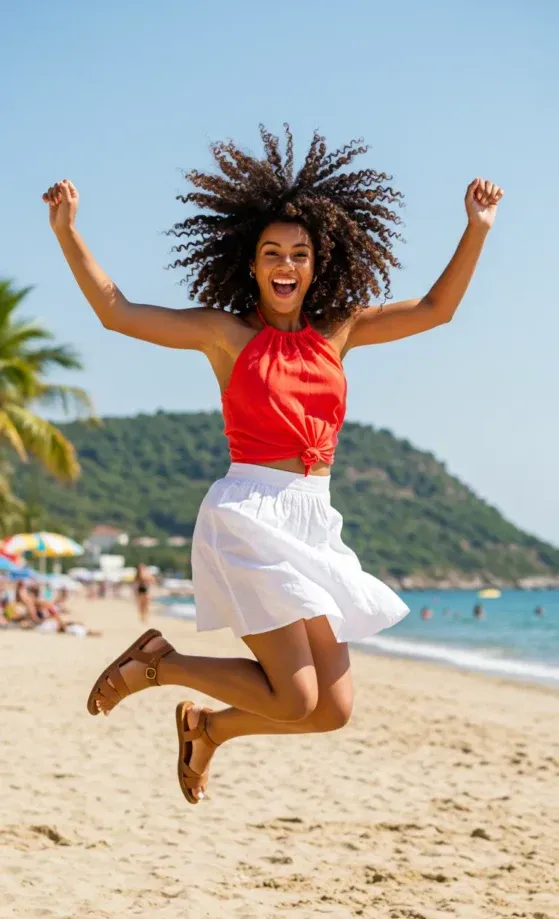 This look is peak summer happiness. The halter-style red crop top brings all the fun and energy with its bold color and playful front tie. Paired with a breezy white high-waisted skirt, it gives off the ultimate carefree beach girl energy. The brown flat sandals keep the look grounded and comfortable, perfect for walking on sand or grabbing ice cream on the boardwalk. Everything about this outfit screams sun, saltwater, and good vibes.
