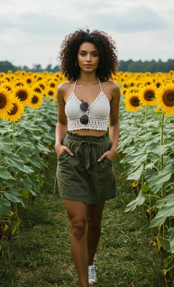 This outfit combines the perfect mix of bohemian vibes and casual comfort. The white crochet halter top adds a playful, textured element, while the olive green skirt keeps things relaxed and stylish. The skirt s drawstring waistband makes it easy to wear, offering both style and functionality. Paired with white sneakers, this look is both practical and fashionable, ideal for a day spent exploring outdoor festivals or sunflower fields, like the one in the picture.