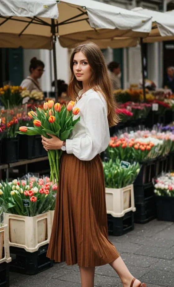 This outfit is giving all the romantic countryside feels in the best way possible. The white blouse is light and airy with those subtle balloon sleeves that make it feel a little extra without being too much. Paired with a rich brown pleated midi skirt, the whole look feels soft, flowy and super feminine. The brown leather sandals match perfectly and keep everything comfy and classic while you re wandering through flower stalls or grabbing fresh produce.