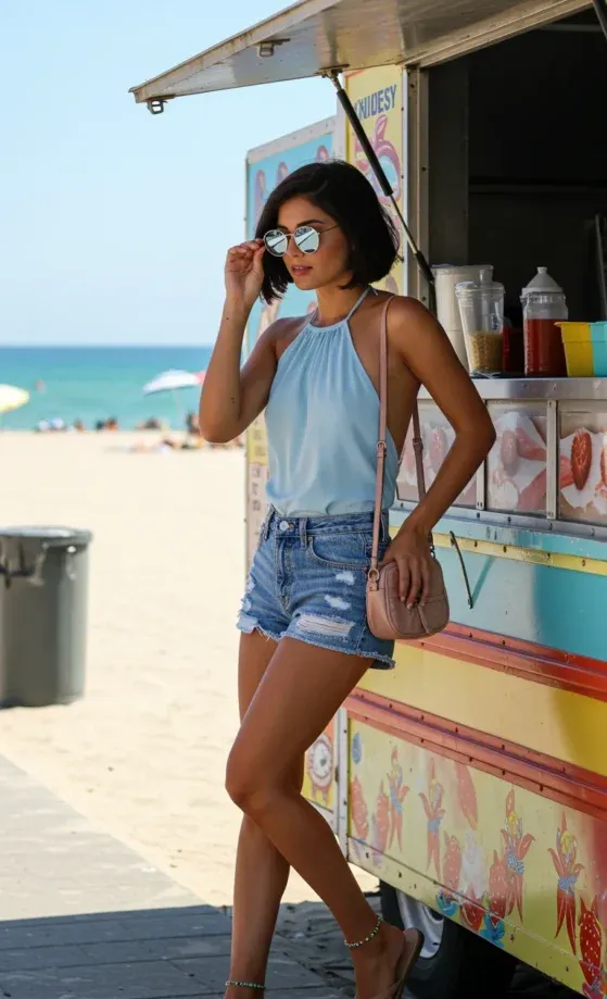This cute summer outfit is perfect for a laid-back beach day. The light blue halter top offers a breezy, relaxed vibe, while the denim shorts add a casual touch that’s ideal for hot weather. The sandals are simple but stylish, with a cute beaded strap that adds a pop of color. Pairing it with a small crossbody bag gives the outfit an easy, carefree feel while still keeping it practical.