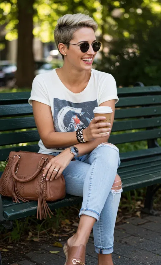 This relaxed and stylish casual outfit is perfect for a day of running errands or meeting up with friends. The graphic tee adds a playful touch to the look, while the distressed skinny jeans give off a cool, laid-back vibe. The brown sandals with gold details are both chic and comfortable, and the brown bag complements the neutral tones of the outfit. A coffee in hand and minimal jewelry complete the look, making it feel effortless but put-together.