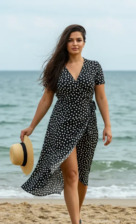 This black and white polka dot wrap dress is the perfect blend of casual chic and fun beach style. The wrap design accentuates the waist and adds a flattering flow, while the high-low hem creates movement with every step. Paired with simple black sandals and a straw hat, this look feels effortlessly stylish for a day at the beach or a sunny stroll by the boardwalk.