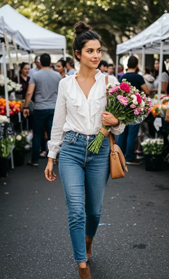 This outfit is a perfect blend of casual comfort and effortless style, ideal for a fun day out at the market or grabbing a coffee with friends. The white ruffled blouse adds a touch of femininity, while the high-waisted, skinny jeans keep it grounded and practical. The tan ankle boots give the outfit a chic edge, and the small handbag is both functional and stylish. Holding a bouquet of fresh flowers just completes the look, adding an extra pop of color and charm.