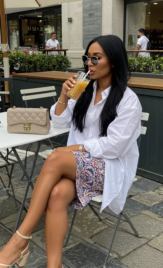 This outfit strikes the perfect balance between casual and chic, ideal for a relaxed café outing or a sunny day in the city. The white oversized shirt is effortlessly stylish, while the colorful skirt adds a fun, lively touch to the look. Paired with neutral heels and a beige handbag, it feels polished without being overdone. The added sunglasses complete the stylish, laid-back vibe, making this look both fashionable and functional.