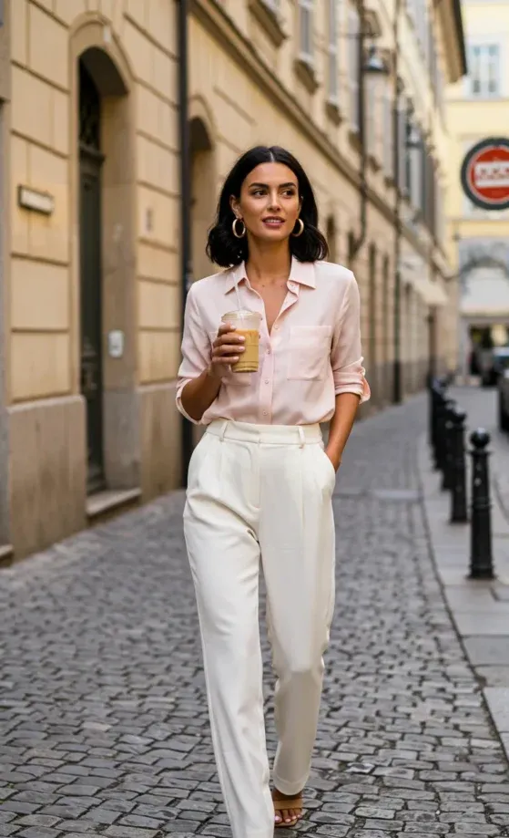 This outfit brings together a refined yet laid-back look that’s perfect for a day out in the city. The soft blush pink blouse is a great choice for a fresh, feminine vibe, and the relaxed fit adds an easygoing touch. Paired with tailored white trousers, the outfit exudes sophistication while keeping it comfortable. Neutral sandals and simple accessories, like large hoop earrings, make this ensemble both stylish and practical for running errands or enjoying a coffee at a local café.