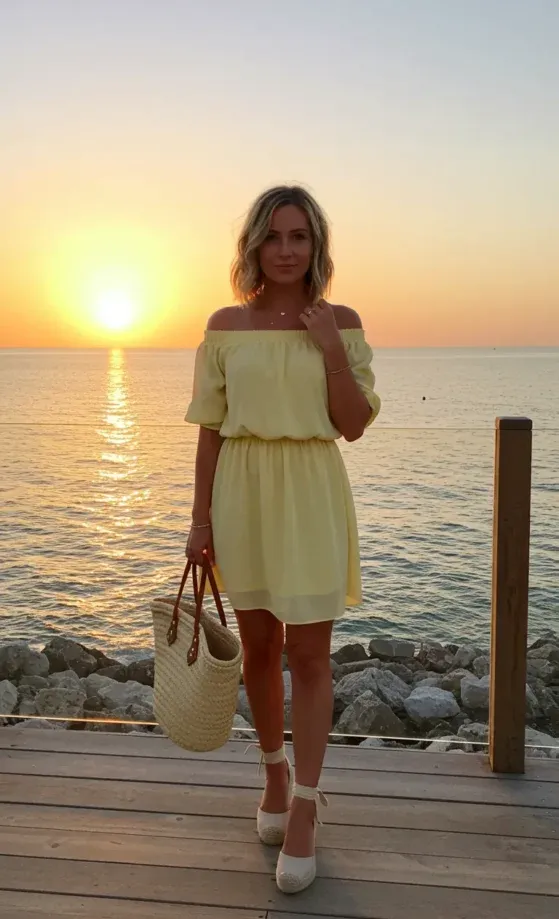 This off-the-shoulder yellow sundress is all about embracing the warmth of summer with a feminine, easygoing style. The light, flowy fabric makes it perfect for a sunny beachside stroll or a casual evening out. Paired with neutral espadrille wedges and a stylish woven bag, the outfit radiates a laid-back yet polished vibe. The soft yellow hue adds a cheerful touch that s perfect for any outdoor summer activity.
