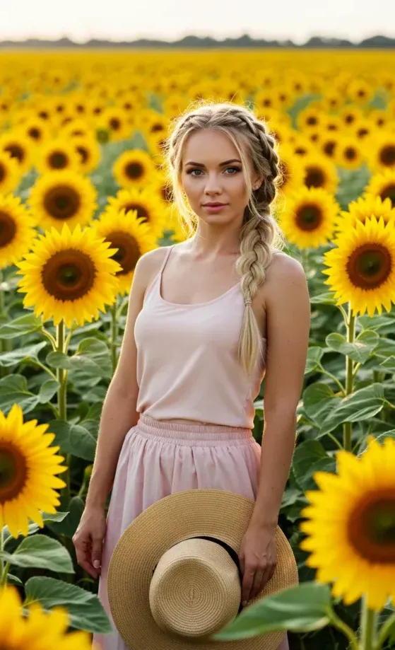 This outfit is perfect for a sunny day spent outdoors, and it radiates effortless summer charm. The soft pink tank top is paired with a flowy, lightweight skirt that moves beautifully in the breeze, giving the outfit a feminine, airy feel. The addition of a stylish straw hat complements the look, making it ideal for enjoying nature or strolling through a sunflower field. Simple yet chic sandals complete the outfit, keeping it comfortable and practical.