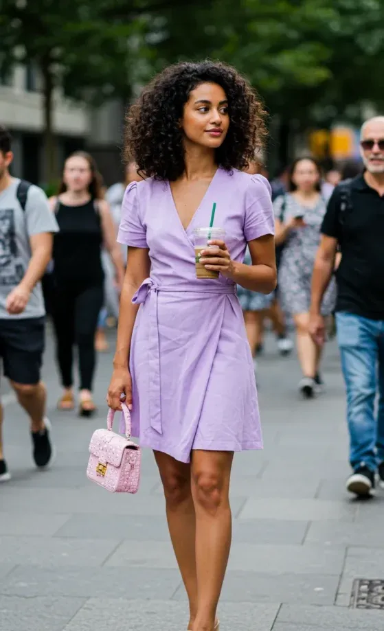 This outfit is all about effortless charm. The short-sleeved lavender wrap dress ties perfectly at the waist, giving it a flattering shape that s as comfy as it is cute. Paired with neutral block-heeled sandals and a structured pastel pink handbag with gold details, the whole look just screams summer in the city. Add in a cool iced coffee for that ultimate street-style vibe, and you ve got yourself a fashion moment that s casual yet put-together.