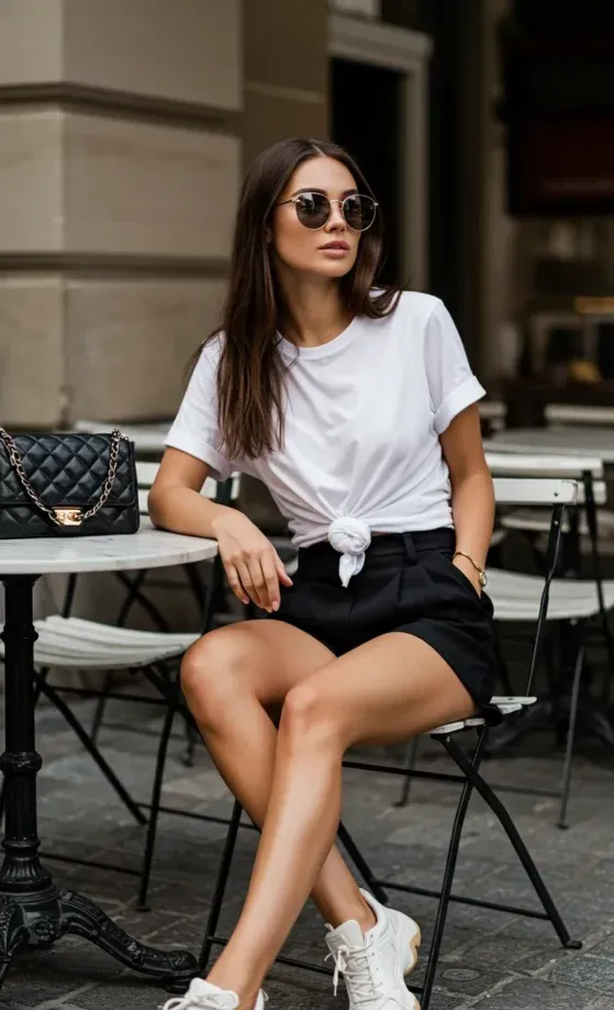 This outfit nails that perfect balance between cool-girl sporty and classic minimalism. A simple white tee is knotted at the waist for a fun, flattering twist, while high-waisted black tailored shorts keep things polished and put-together. Chunky white sneakers add comfort and street-style edge, and the oversized sunglasses and quilted chain-strap bag bring just the right amount of glam to pull everything together.