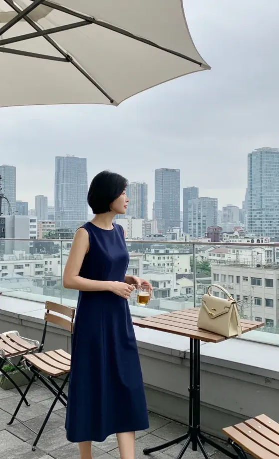 This outfit is a whole vibe for those summer days when you want to look polished but still feel totally at ease. The sleeveless navy midi dress is sleek, simple, and totally timeless. With its clean lines and modest cut, it flatters the figure without trying too hard. Paired with classic black ballet flats and a structured cream handbag, it s giving major modern city chic. The minimal accessories let the dress speak for itself, and the whole look feels quietly confident and put-together.