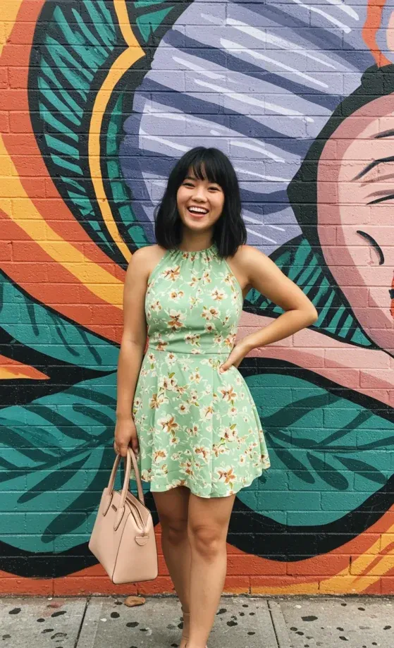 This cute green floral dress is perfect for a laid-back yet stylish day out in the sun. The halter neckline adds a subtle touch of sophistication, while the soft, flowy fabric gives it a relaxed feel. The light green color with delicate floral prints screams summer, making it the perfect outfit for an afternoon stroll, brunch date, or weekend outing. Paired with a neutral handbag and simple strappy sandals, it s easy to see why this look works for so many occasions.