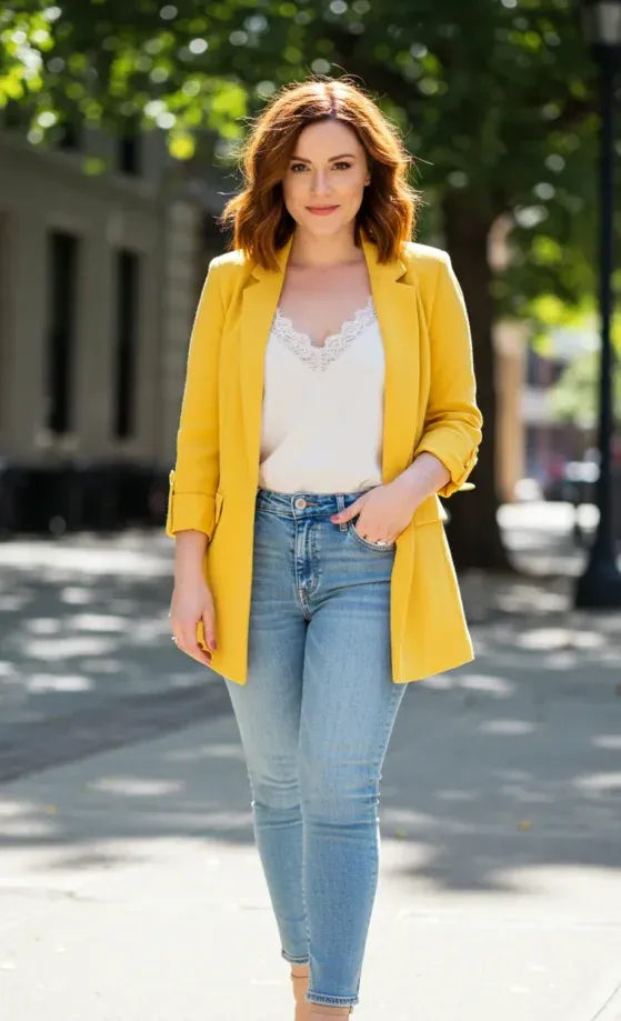 This look is bright, playful, and just plain fabulous. The sunny yellow blazer instantly catches the eye and adds a bold pop of color that screams summer energy. Underneath, the white lace-trim camisole keeps things light and feminine, while the high-waisted skinny jeans pull it all together with a clean and classic silhouette. Add in those nude strappy heels for the perfect touch of elegance and you ve got a whole vibe that works from brunch to casual meetings.