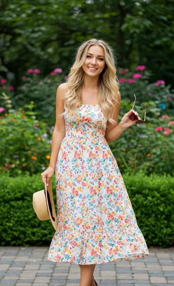 This outfit is all about that effortless summer charm. The strapless midi sundress features a colorful floral print that s as cheerful as a sunny afternoon in full bloom. The fit-and-flare shape hugs at the waist then flows out into a breezy, ruffled hem that moves so beautifully when you walk. Paired with simple nude sandals and accessorized with classic summer staples like a straw hat and oversized sunnies, this look is basically made for twirling through gardens or strolling at farmers markets.