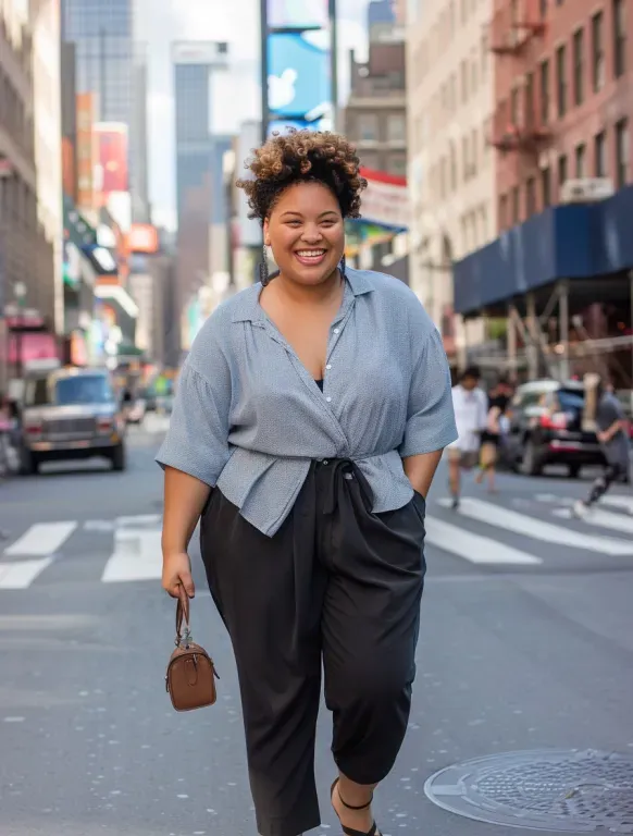 This stylish plus-size summer outfit combines a relaxed yet polished look, perfect for any day out in the city. The light blue short-sleeve shirt has a subtle checkered pattern and ties neatly at the waist, giving a flattering shape while maintaining comfort. Paired with loose-fitting black high-waisted pants and flat sandals, this ensemble offers a laid-back, chic vibe. The small brown handbag adds a touch of sophistication, completing the look with minimal effort.