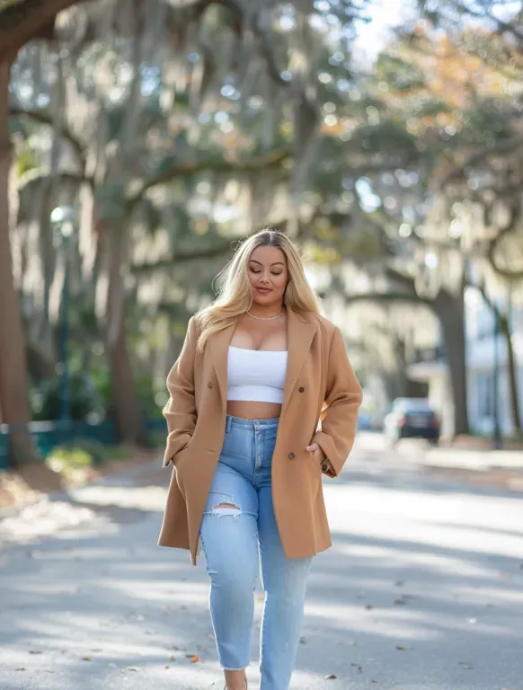 This outfit brings a perfect blend of summer and fall with its light, yet chic look. The ensemble features a classic white crop top paired with high-waisted, distressed light blue jeans that offer both style and comfort. Over it, the camel-colored double-breasted coat adds a sophisticated touch, making this look ideal for breezy summer evenings or transitioning into cooler weather. Nude pumps complete the outfit, bringing a touch of elegance to the otherwise casual vibe.
