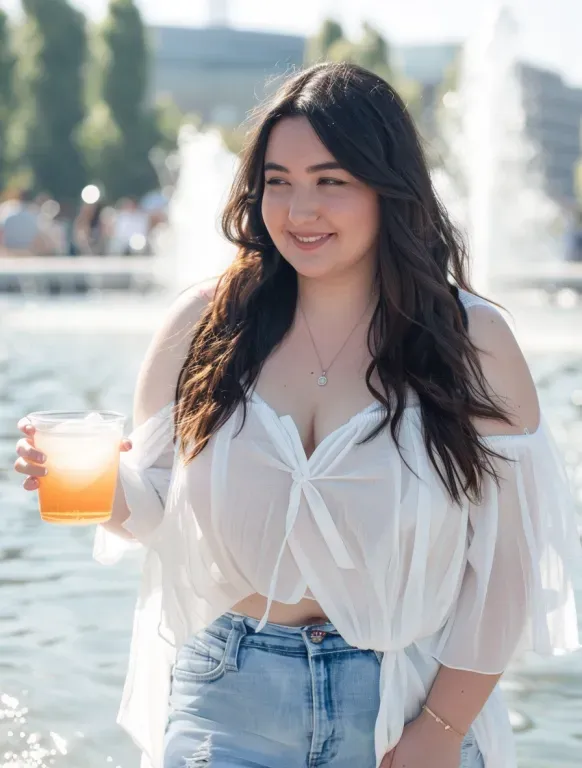This outfit is the definition of laid-back summer style. The white tie-front top adds a casual, breezy vibe with its flowing, semi-sheer fabric that lets you feel the warm breeze. The top is paired perfectly with distressed, light-wash jeans that give the look an edge. The rolled-up sleeves and slightly loose fit of the top make it look effortless and chic, while the ripped jeans provide just the right touch of urban cool. It s a simple yet stylish ensemble perfect for an afternoon stroll or grabbing a coffee by the fountain.