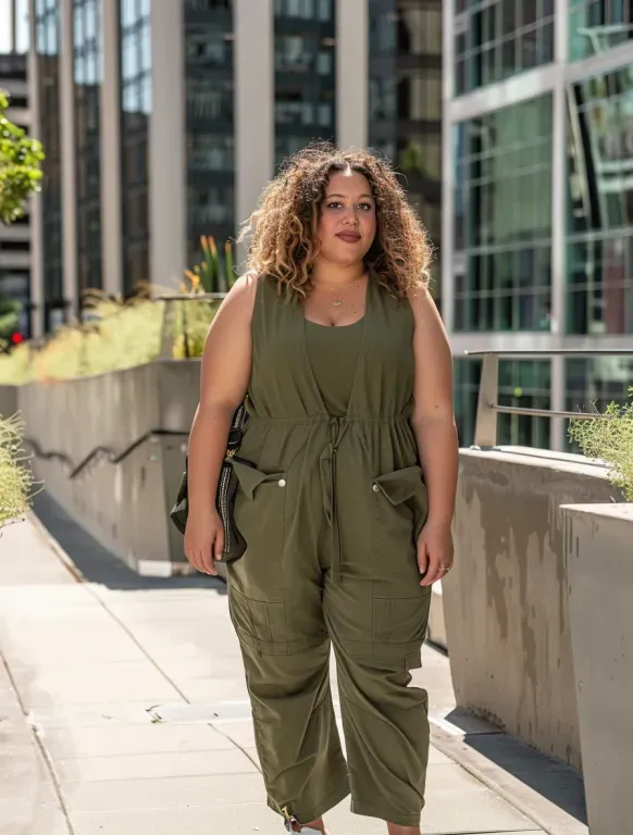 This olive-green utility jumpsuit is a perfect blend of practicality and style, with its relaxed fit and stylish details. It features a zip-up front, oversized pockets, and an adjustable waist, making it not only fashionable but functional too. The soft fabric allows for all-day comfort, and when paired with simple white sneakers, the look is both sporty and chic. The simple design of the jumpsuit is elevated by the matching olive-green tank underneath, making it an effortlessly stylish outfit for the summer.