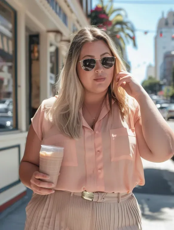 This effortlessly chic summer outfit features a soft blush-colored button-up blouse paired with pleated beige shorts, offering the perfect balance of comfort and sophistication. The blouse has a relaxed fit, with a subtle sheen that catches the light, making it look polished yet casual. The pleated shorts add structure to the outfit, while the belted waist ensures a flattering silhouette. Paired with stylish sunglasses and a refreshing iced coffee, this outfit is ideal for a sunny day in the city.